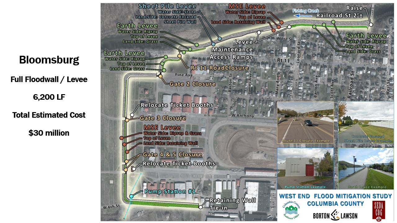 reWelcome, and thank you for visiting the official webpage for the West End Flood Mitigation Projects. Columbia County Commissioners, in coordination with SEDA-Council of Governments (SEDA-COG) and the engineering firm Verdantas (formerly Barton Lawson), are continuing long-term efforts to address recurring flooding in the West End of Bloomsburg.